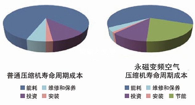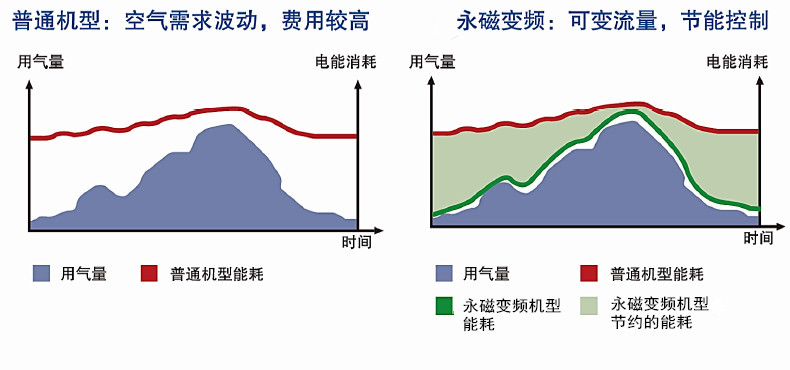 永磁變頻空壓機可以精確的滿足用戶的空氣需求。當用戶的用氣量降低時,排氣量相應地減少,同時能耗也按比例下降。通過先進的變頻技術,大大的減少了空壓機的卸載,使能耗大大下降。永磁變頻空壓機可跟蹤空氣需求量的變化自動調節電機轉速,平均節能可達50%。